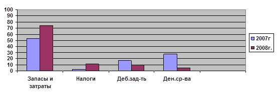 В целом структура оборотных активов на 1 января 2009г. по сравнению с 1 января 2008г. немного ухудшилась. Следует обратить внимание на низкий удельный вес денежных средств в составе оборотных активов, снижение запасов и затрат.